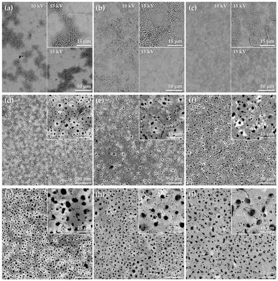 Surface morphologies of the PEO coatings formed on zirconium up to 200 (a–c), 300 (d–f) and 400 V (g–i) in the Ca1P2 (a,d,i), Ca2P1 (b,e,h), and (CaMg)2P1 (c,f,i) solutions. In the case of the samples that were treated up to 200 V half of the image is presented under accelerating voltage of 10 kV, while the other half was taken at 15 kV. The insets correspond to the larger magnifications of the same images.