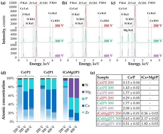 This is due to relatively low charge passed through the surfaces, combined with the small energy of the MDs just after the breakdown voltage was reached (Figure 2a–c). The bar graph in Figure 4d shows the relative changes in the concentration of the surface elements in the oxide layers. Oxygen was not included in the calculations as its atomic weight is too small for this element to be quantifiable by EDX. From the data, it can be seen that phosphorus is much easier to incorporate into coatings than calcium and magnesium. Negatively charged hypophosphite ions are much more likely to incorporate into positively charged anode than the Ca2+ and Mg2+ ions. The degree of incorporation of the latter two was higher at higher voltages when the MDs were more energetic. Furthermore, less and less zirconium was present on the coatings’ surface as the voltage was increased. The Ca/P and (Ca+Mg)/P atomic ratios that are presented in Figure 4e indicate that the elemental composition of the coatings was closely related to that of the solutions. Magnesium was also found to be the dominating PEO electrolyte component introduced from the solution in the coatings that were prepared by Ha et al. [46], with the Ca/Mg atomic ratio in the coating being the same as the proportion of these elements in the bath. Nonetheless, the surface morphology of the films that were obtained in their work was different from that presented here. However, the presented results must be considered with care because of the difficulty of distinguishing between the EDX signals corresponding to zirconium and phosphorus, which complicates the quantification of these two elements [63].