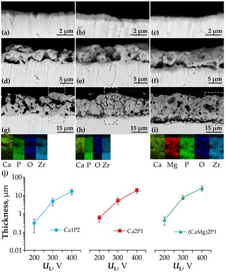 SEM cross-sections of the PEO coatings formed on zirconium up to 200 (a–c), 300 (d–f), and 400 V (g–i) in the Ca1P2 (a,d,i), Ca2P1 (b,e,h), and (CaMg)2P1 (c,f,i) solutions. Rectangles in the images of the coatings produced at 400 V represent the regions of EDX elemental mapping, results of which are presented directly below the corresponding images. The ranges of the measured thickness (j) were calculated as mean ± SD for each coating.