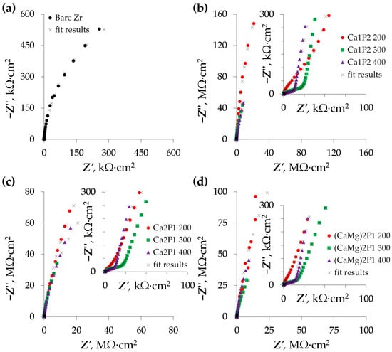 From the spectra in Figure 7, it can be inferred that the studied surfaces exhibited one or two capacitive loops, which is typical for the corroding metal systems. The bare zirconium sample was characterized by a single loop that was clearly visible in Figure 7a. The spectra belonging to the Zr coated by the PEO layers were slightly more complicated. For the coatings formed in the Ca1P2 electrolyte (Figure 7b), two time constants were discerned from two distinct capacitive loops. It is noteworthy that the size of the high-frequency loops (inset in Figure 7b) decreased with the limiting anodization voltage. Similar features and trends were found in the spectra belonging to the coatings that were obtained from the other solutions as well (Figure 7c,d).