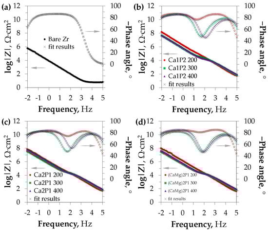 The spectra of the PEO coatings were shown to exhibit higher impedance than that of the bare zirconium surface in the entire frequency range, as it can be deduced from Figure 8. This was the evidence of their good anti-corrosion performance. Furthermore, the corrosion resistance of the thin oxide films (obtained at UL = 200 V) was superior to that of the thick coatings that were obtained at 300 and 400 V. The difference in |Z| between the latter two was insignificant in the case of the Ca1P2 electrolyte (Figure 8b). However, for the Ca2P1 and (CaMg)2P1 solutions, it was found that the treatment at 400 V led to the higher impedance of the system as compared to that conducted at 300 V (Figure 8c,d). The similar shapes of the spectra were also obtained for Ta and Nb in the similar solutions systems [56,57] and for the titanium substrates with ZrO2-containing PEO coatings, as determined by Babaei et al. [68]. Nonetheless, the overall impedance of the coatings studied in this research was at least one order of magnitude higher compared to the cited reports.