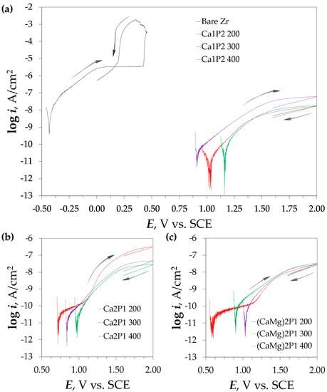 Potentiodynamic polarization curves recorded for the bare zirconium surface and the PEO coatings formed in Ca1P2 (a), Ca2P1 (b), as well as (CaMg)2P1 (c) solutions. Arrows indicate the direction of the potential scans.