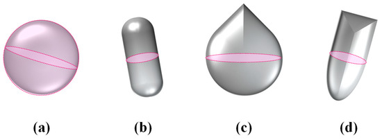 Examples of rigid particles having (a) spherical (b) pill-box (c) drop and (d) bullet shapes and the corresponding circular cross-sectional area (indicated by the dashed line) of radius r.