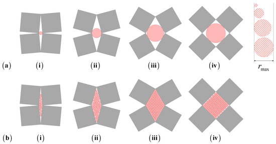 Comparison of different particles sizes as a rotating rigid unit system is stretched (i to iv), illustrating the notion of (a) pore size and (b) space coverage.