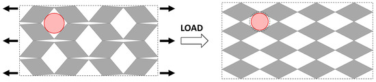 Type IIβ parallelograms, together with Type β rhombi, Type II rectangles and squares offer the most consistent Poisson’s ratios, making them perhaps the most ideal to use for filtration applications. For these systems, the Poisson’s ratio is always negative and fixed at a value of −1, so that filters based on these geometries retain their initial proportions. In this respect, it is important to note that auxeticity does not necessarily imply that the pore size increases as the system is stretched, even though the area of the system increases. In other words, in general, there can be no definite association between a negative Poisson’s ratio and an increase in pore size. In fact, from Table 2, one may note that there are ranges of θ over which the Poisson’s ratio is negative and the pore radius decreases on stretching (e.g., Type β rhombi and Type IIβ parallelograms). Such behaviour, however, is only possible because of the presence of two different sets of pores which behave opposite to each other, i.e., as the structure is stretched towards its fully opened configuration, one set of pores open up while the others close down in such a way that the maximum pore radius decreases while the system itself expands in all directions (see Figure 4). It is also interesting to note that in the fully open configuration of Type β rhombi all pores have the same size so that more particles of that radius can pass through than in any other configuration. This offers a way how to control the rate of flow of particles through the filter allowing it to be set on two modes—a low transmission mode and a high transmission mode.