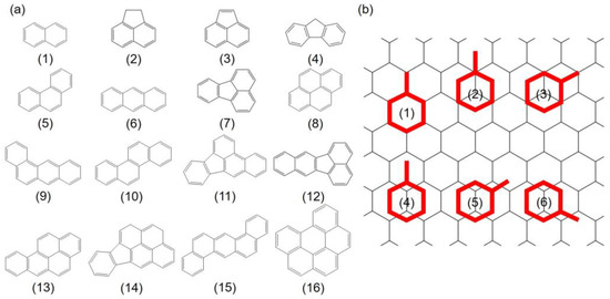 A total of 16 PAHs containing 2 to 6 fused rings with a wide range of molecular weights (128.2–278.4 g/mol) and C:H ratio (1.20–1.83) were selected in this study, as enlisted in Table 1 and Figure 1a.
