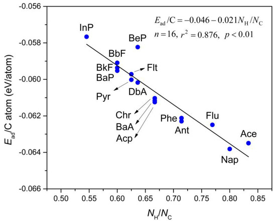 Figure 3 depicts the computed Ead/C atom values, which is a linear relationship as a function of the H:C ratio in the PAHs molecules (NH/NC). This relationship directly fits to the equation shown as Equation (2):