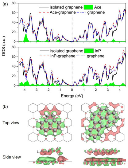 (a) Calculated density of states (DOS) for Ace/Gr (up) and InP/Gr (down) systems. The Fermi level was set as zero; (b) Differential electron density (Δρ) for Ace/Gr (left) and InP/Gr (right) adsorption systems. Isosurface contours of electron density differences are drawn at ±0.001 e/Bohr3. The electron accumulation and depletion are depicted in red and green colors, respectively.