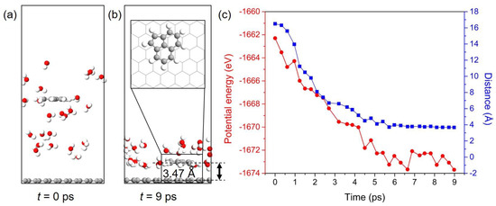 An exemplified model of Ace/Gr system was used to perform AIMD simulation to further study the dynamic behavior of PAHs adsorbed on Gr. One Ace molecule is placed in the water environment, and the distance between Ace and Gr is approximately 16 Å in the initial simulation box, as shown in Figure 7a. Ace molecule is finally adsorbed onto Gr and floated in a coplanar configuration after AIMD simulation of 9 ps. In addition, Ace molecule ends in an adsorption configuration that is different from the one obtained from DFT calculations. This can be explained by the temperature induced energy fluctuations in the AIMD simulation. This also indicates that the PAHs can diffuse or rotate on the Gr surface even under low or room temperature as the energy differences between various adsorption configurations are relatively small (see Supplementary Table S1 for details). According to simulation results, the equilibrium distance between Ace and Gr is approximately 3.47 Å, which is slightly larger than the value obtained from DFT calculation. The evolution of the potential energy and distance between Ace and Gr with respect to the time of the AIMD simulation is shown in Figure 7b. The potential energies and distances of the adsorption systems continuously reduce before the equilibrium state is achieved. PAHs have been proved to possess negligible or limited hydrogen bonding capacity [69]. Therefore, the adsorption of PAHs onto Gr cannot be directly promoted by the hydrogen-bonding interaction, whereas the water molecules around Ace can construct a hydrogen-bonding network. The adsorbates onto Gr can be further stabilized by the network through limiting their movement. Even though the hydrophobic interactions were demonstrated to be the primary driving force for PAHs adsorption, Ace can still interact with water molecules through the hydrogen bonds because of hydrogen atoms. Thereby, we conclude that the hydrogen bonds should exist between the interface of adsorbates and water, and they can further stabilize the adsorption systems. Therefore, the AIMD simulation indicates that the PAHs pollutants can be quickly captured by Gr and confirm the potential of Gr to adsorb and remove these aromatic pollutants.