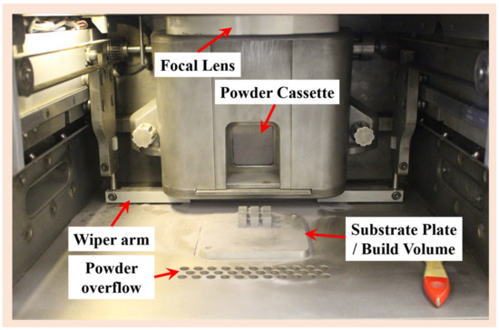 The SLM experiments were carried out on a Sinterstation® Pro DM125 SLM System from 3D Systems, Inc. (Rock Hill, SC, USA) (shown on Figure 1). Sinterstation® Pro DM125 SLM System is equipped with a fiber laser (max. power 200 W) (Southampton, UK) with a laser beam diameter of 35 μm at the powder surface. This also includes an automatic powder spreading system, an inert gas (Ar) protection system and a powder bed preheating system. The layer thickness can be varied between 20–100 μm and the maximum laser scan speed of 1000 μm/s can be achieved.