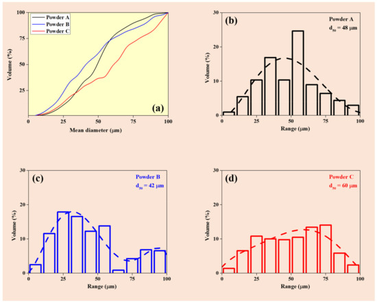 Particle size distribution for the powders (a) comparison of powders A, B and C as a function of mean diameter and Vol. % and particles size distribution bar charts for (b) powder A, (c) powder B and (d) powder C.