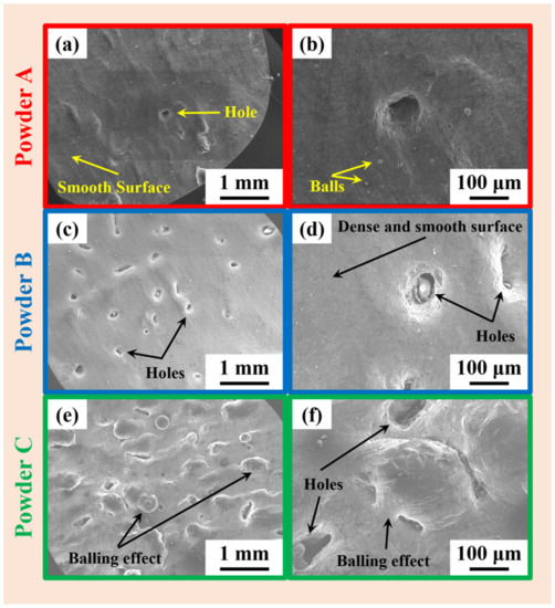 AlSi12 samples fabricated from all the three different powder batches processed under equal conditions have shown different behavior during SLM. Figure 5 shows the SEM microstructures of the top surface morphology of the AlSi12 SLM samples fabricated from different powder batches. The top surface of the specimen fabricated from the powder A show a dense and smooth morphology almost without inclusions, except for the tiny metallic balls that form from the splashing of small liquid droplets arising from the fast moving laser beam [20]. In addition, one or two (countable) number of holes were also observed. On the contrast, the samples prepared from powder B show a large amount of surface imperfections in the form of holes with dense and smooth areas between the holes. Powder B has a poor flowability due to large volume of fine particles, hence there is a difficulty in the formation of a homogenous/uniform and dense powder layer [49]. This results in a powder bed with non-uniform distribution of powder and hence the holes are formed where there is a scarcity of powder during melting. The surface of the SLM AlSi12 samples prepared from powder C show the presence of both holes and large spherical objects (>100 μm in diameter). The large spherical particles are the result of balling effect [53]. “Balling” occurs due to instability in the melt pool. This instability in the melt pool is due to the high surface tension gradients resulting from Marangoni convention effect [54,60]. Powder C has the highest LTeff value (among the three powder batches) and hence the low apparent density. Accordingly, low-density powder beds have low effective thermal conductivity [55], because of the presence of voids (air pockets) in the powder bed. Hence during laser melting, the melt pool will be shallow at some places than other, and the melt pool is over heated in these places. This overheating of the powder bed/melt pool at isolated places result in high temperature gradients and hence results in “balling” effect. The relative densities of the AlSi12 SLM specimens fabricated from the different powder batches are presented in Table 4. As expected, the specimens from the powder A have the highest relative density compared to powders B and C, corroborating with the SEM images in Figure 5, which again boils down to the spherical nature of the powder, flowability, and apparent density, which are closely connected to each other.