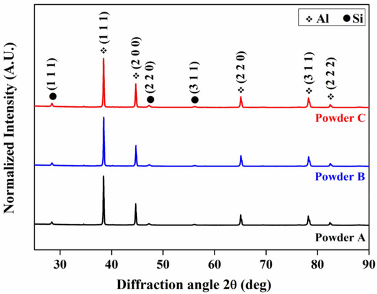 Figure 6 show the XRD patterns of the AlSi12 SLM samples prepared from different powder batches. As expected the XRD patterns show the crystalline peaks of two distinct phases: Al and Si. The intensity of the Si peaks are drastically reduced, even though the solubility of Si is limited in Al at room temperature. The reduced intensity in the Si peaks are due to the formation of the supersaturated solid solution of Si in Al, due to high cooling rates observed during the SLM process [28,35]. This is very similar to the other published reports, where the supersaturation of Si in Al is well established [28,31,35,36]. On the other hand, there is no crystallographic texture observed in these samples as compared with published reports [28,31,35]. The absence of texture in these samples can be attributed to the laser scan strategy used during the fabrication process, where the scan rotation of 37° is used between the layers unlike the published reports, where a scan rotation of ~73° is used [28,35,61]. However, it is interesting to note that the AlSi12 SLM samples prepared from the three different powder batches show similar XRD patterns with no significant difference between them. It suggests that the changes in the minor composition, morphology of the AlSi12 particles and the production process do not have a significant influence on the structural properties of these SLM fabricated AlSi12 samples.