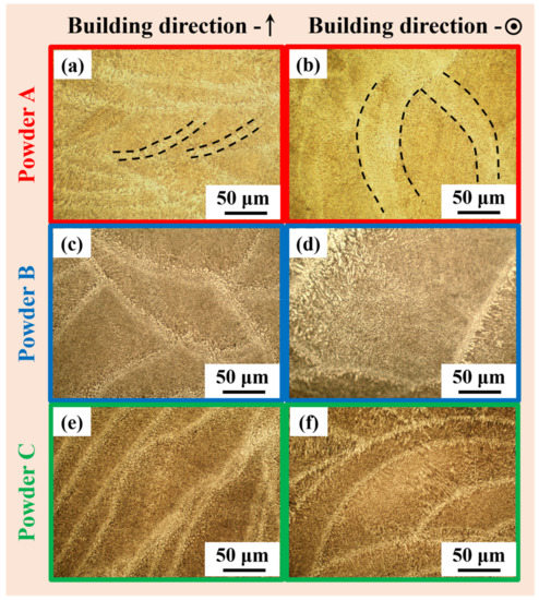 After the fabrication of parts by SLM, SEM was used to examine the top surface morphology of the specimens. Then the specimens were cut both parallel and perpendicular to the building direction, subsequently mounted, grinded and polished following the standard metallographic procedures. Non-etched cross-sections were examined by Olympus GX51 (Olympus Corporation, Tokyo, Japan) inverted optical microscope (OM) at 20× magnification for porosity determination and according to the procedure described by Spierings et al. [48]. Porosity was calculated by area fraction analysis from the OM micrographs using GIMP 2.8.22 software (version: 2.8.22). The porosity values reported are average values of the three specimens from each powder batch using a 95% confidence interval. From the porosity calculations, the relative densities were calculated simultaneously. The polished cross-sections were then etched using Keller’s reagent (95 mL water, 2.5 mL HNO3, 1.5 mL HCl, 1.0 mL HF) and the microstructural examination was carried out using OM and SEM.