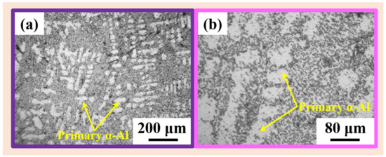 Optical microstructure of cast AlSi12 specimen at (a) lower magnification and (b) higher magnification, showing the presence of primary α-Al and Al-Si eutectic microstructure.