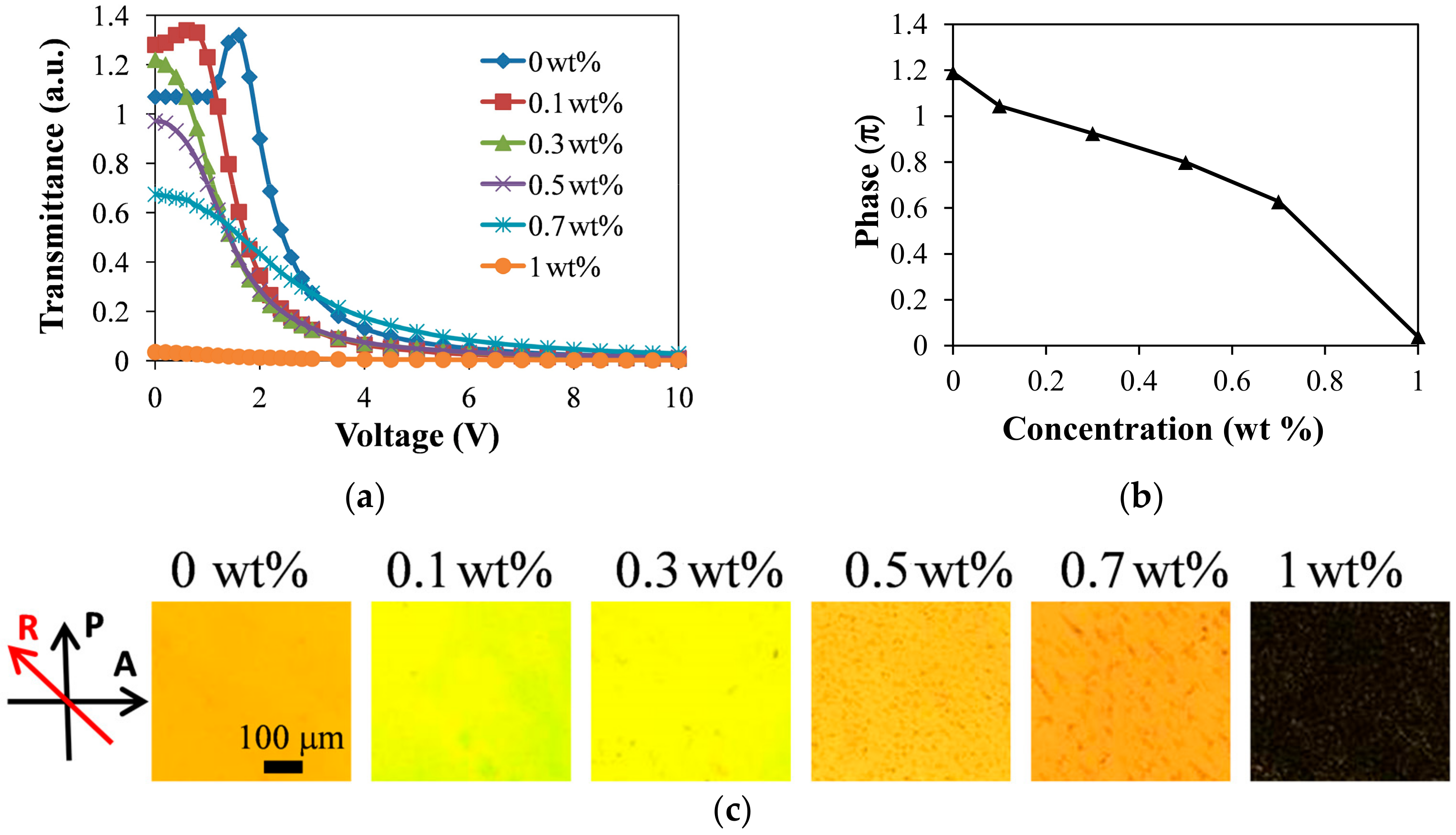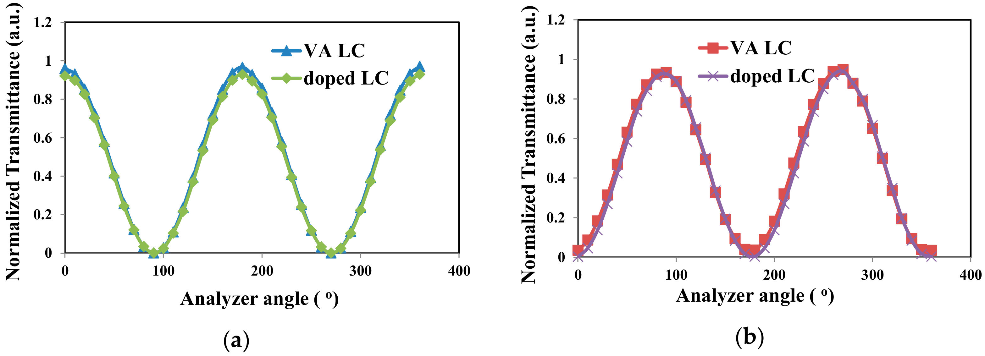 - Hwang, S.J.; Jeng, S.C.; Yang, C.Y.; Kuo, C.W.; Liao, C.C. Characteristics of nanoparticle-doped homeotropic liquid crystal devices. J. Phys. D Appl. Phys. 2009, 42, 025102. [Google Scholar] [CrossRef]