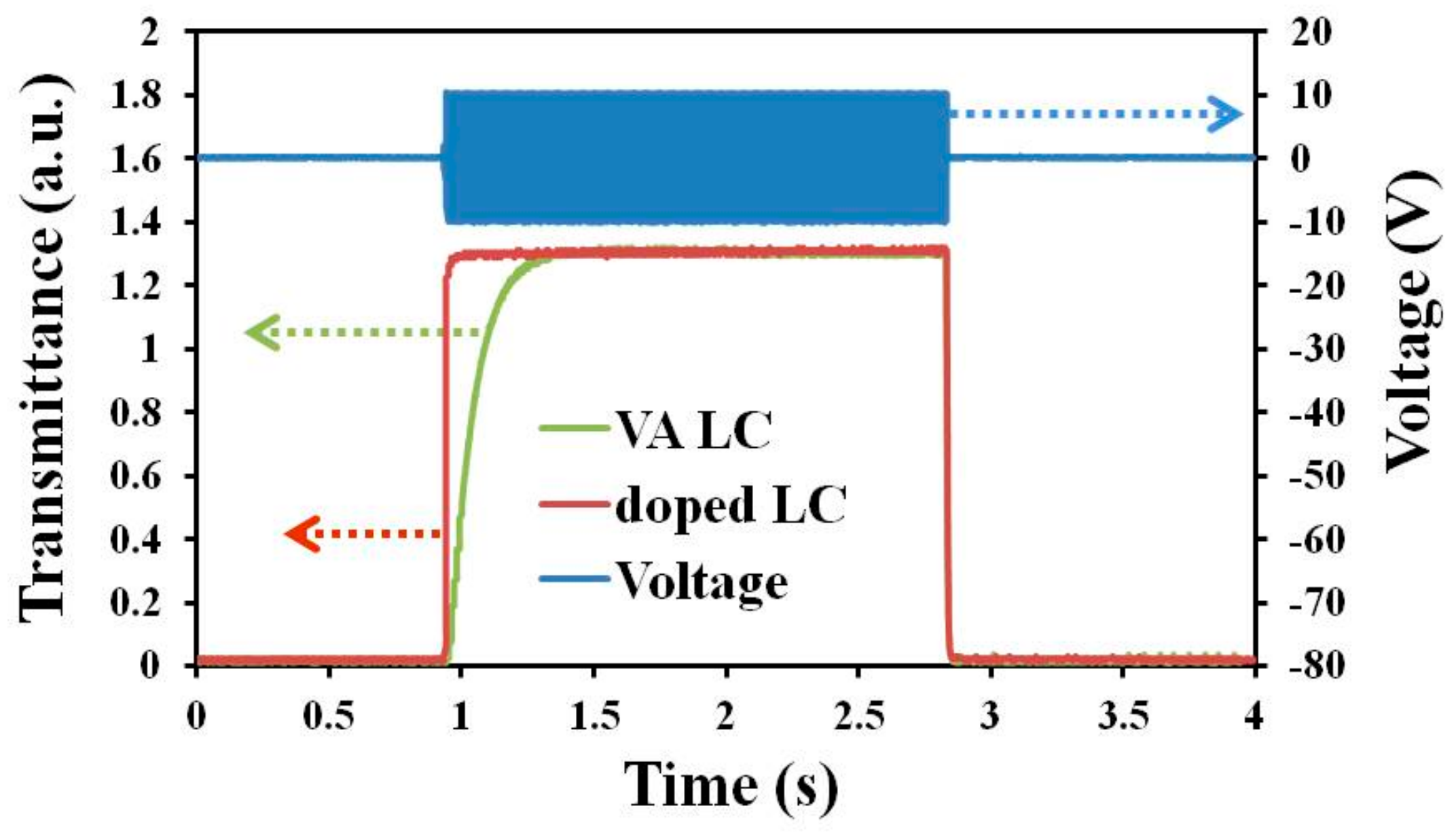 - Utsumi, Y.; Kamei, T.; Naito, R.; Saito, K. Measurement methods of nematic liquid crystal response time. Mol. Cryst. Liq. Cryst. 2005, 434, 337–352. [Google Scholar] [CrossRef]