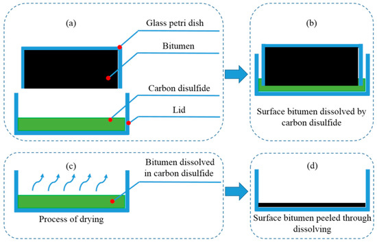 Figure 1. Peeling procedure, dissolving layer by layer. - The second group of samples was used to explore the aging effect between samples with and without UV radiation. Bitumen was dissolved by carbon disulfide first and then the solutions were dropped onto a blank KBr slide [29,30]. After drying, the solutions turned into a thin film. The concentration of the solutions was 5 wt % and the thickness of the film after drying was approximately 10 μm. Samples were divided into two parts, as shown in Figure 2. These parts were separated by a septum, which UV radiation cannot penetrate. The region between the septum and the samples below the septum was approximately 1 cm, which guaranteed that the atmosphere could circulate. Samples were UV aged for 5 d at 50 °C. The average intensity of UV radiation on the Bu’ surface was 10 W/m2. The ozone concentration was about 0.4 ppm in the environment and about 1.2 ppm in the oven, which was tested by a gas detector (uSafe 2000/300, Sundo Shenzhen Technology Co., Ltd., Shenzhen, China). After UV aging, samples were tested by Fourier Transform Infrared (FTIR, Nexus, Thermo Nicolet Corp., Waltham, MA, USA) Spectroscopy. Samples on the septum and samples below the septum were abbreviated as Bu and Bb respectively.