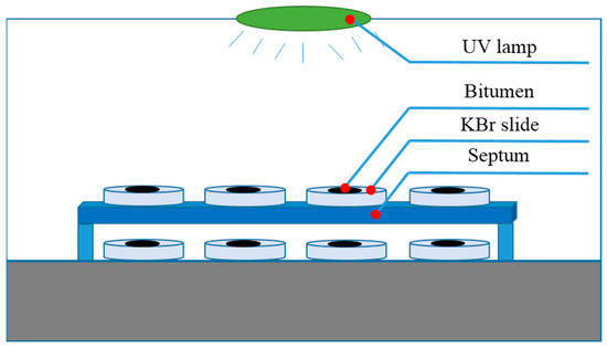 Bitumen aging generally consists of short-term thermal oxidation aging, long-term thermal aging and UV aging [12,13]. Although UV aging only occurs on superficial layers [14], the effect of UV aging on the properties of bitumen and pavement cannot be ignored [15,16]. Short-term thermal aging is generally evaluated using aging tests, such as the Thin Film Oven Test (TFOT, ASTM D 1754) or Rolling Thin Film Oven Test (RTFOT, ASTM D 2872) [17]. Long-term thermal aging is generally assessed by the Pressure Aging Test (PAV, ASTM D 6521) [18]. Unlike thermal aging, there is still no standard UV aging method for bitumen. After UV aging, the characterization methods for bituminous properties are still not unified [19,20].