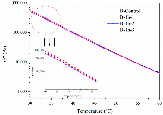The complex modulus of B in different layers for 1 h from 30 °C to 60 °C is shown in Figure 4. The complex modulus of B in the first layer slightly increased after aging for one hour. This means that it was influenced by the UV radiation. Furthermore, the complex modulus of B in the second and third layers was the same as complex modulus of the original bitumen. This means that the UV radiation had no aging effect on the bitumen in these two layers.