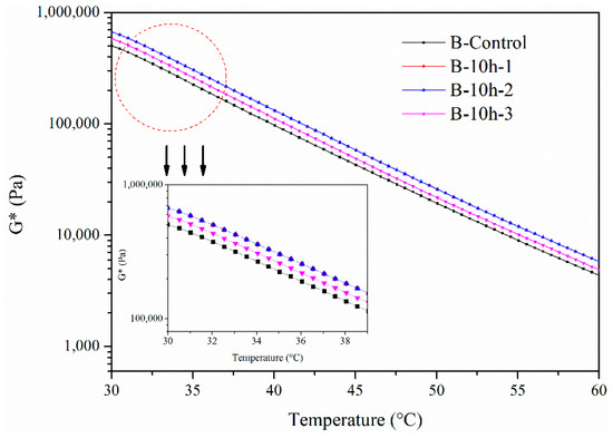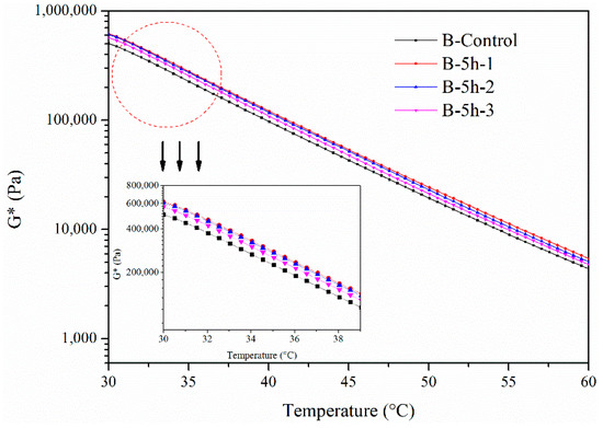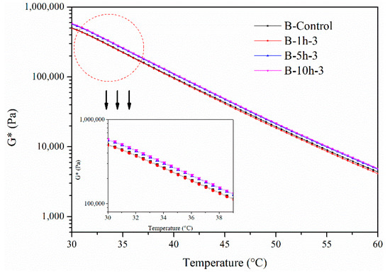 The complex modulus of B in the third layer, aged for different aging times from 30 °C to 60 °C, is shown in Figure 8. It can be seen that the complex modulus of B in the third layer aged for 1 h was the same as the original bitumen. After aging for 5 h, the complex modulus increased. The degree of aging was accelerated after aging for 10 h. This means that UV radiation only had an impact on the surface bitumen. With an increase in aging time, the aging depth due to UV radiation reached the first layer after 1 h and after UV aging for 10 h, the aging depth increased and was no longer in the first layer. In other words, aging depth accelerated due to changes in material properties.