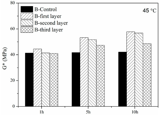 The complex modulus of B in different layers for 10 h from 30 °C to 60 °C is shown in Figure 6. Furthermore, the complex modulus of bitumen at 45 °C in different layers is illustrated in Figure 7. The tendency of the UV aging of the bitumen was similar to the situation in which the bitumen was aged for 5 h. The complex modulus of B in these three layers was higher than it was in the original bitumen. This means that UV radiation influenced B in these three layers after aging for 10 h. Additionally, B in the first and the second layers showed a higher complex modulus than in the third layer, which means that the aging effect in different layers was different.