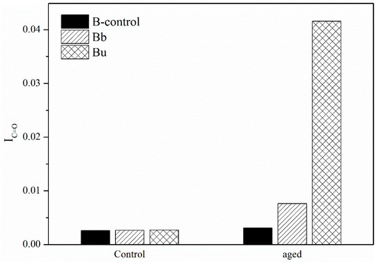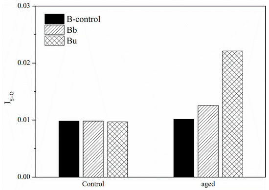 IC=O and IS=O of B in the second group are shown in Figure 9 and Figure 10. After UV aging, IC=O and IS=O of Bu increased. However, IC=O and IS=O of Bb was only slightly more than original bitumen. This means that the bitumen on the septum was seriously aged by the UV radiation. Otherwise, the bitumen below the septum was influenced by ozone and the effect was very small. Furthermore, although ozone had an effect on bitumen, the increment of aging depth was not closely related to ozone because the effect was too small.