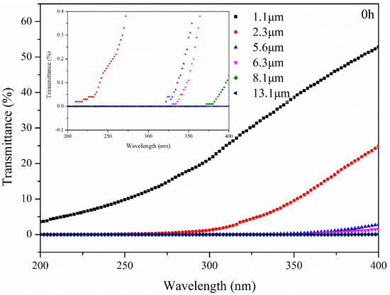 Figure 11 shows the transmittance of bitumen with different thicknesses after UV aging for 1 h. After UV aging, the transmittance of B with different thicknesses increased. All the UV radiation from 200 nm to 400 nm could pass through B with 2.3 μm thickness. UV radiation was blocked at 318 nm, 322 nm, and 368 nm by B with 5.6 μm, 6.3 μm and 8.1 μm thickness, respectively. The transmittance of B with 13.1 μm was still 0%. This means that UV radiation still cannot pass through a bitumen film with 13.1 μm thickness, although the transmittance of B increased because of the UV radiation.