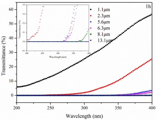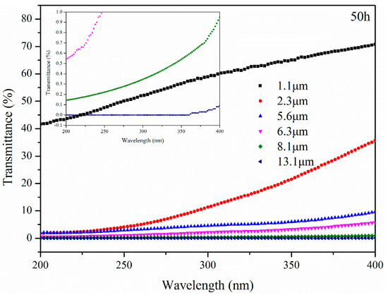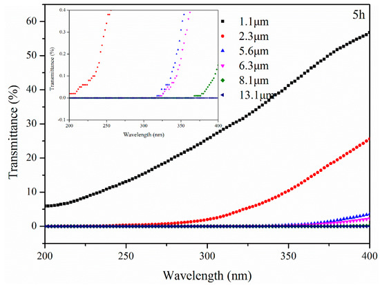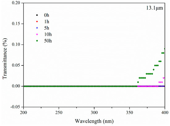 Figure 15 presents the transmittance of bitumen with different thicknesses after UV aging for 50 h. After aging for 50 h, UV radiation from 200 nm to 400 nm could pass through B with different thicknesses, except for 13.1 μm thickness. This means that B under a surface of 8.1 μm thickness was aged by UV radiation directly. UV radiation was blocked at 362 nm by B with 13.1 μm thickness. B below 13.1 μm thickness could be aged by more UV radiation compared to B that was aged for 10 h.