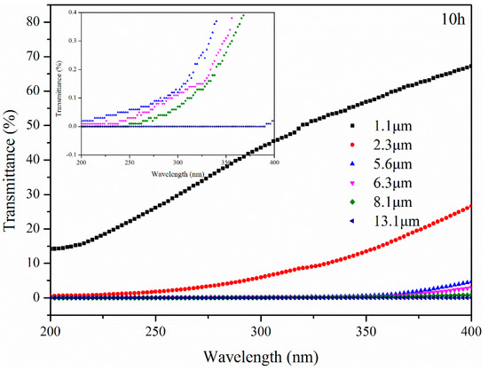 The transmittance of bitumen with different thicknesses after UV aging for 10 h is illustrated in Figure 14. The transmittance of B further increased after UV aging. Furthermore, UV radiation from 200 nm to 400 nm wavelength could pass through B with 5.6 μm and 6.3 μm thickness after aging for 10 h. This means that after aging for 10 h, bitumen below 6.3 μm thickness of surface was aged by UV radiation at all wavelengths directly. Otherwise, B with 8.1 μm and 13.1 μm thickness blocked UV radiation at the 250 nm and 392 nm wavelengths, respectively. This means that B below 13.1 μm thickness began to be influenced by UV radiation from 392 nm to 400 nm directly and that the effect was extremely small.