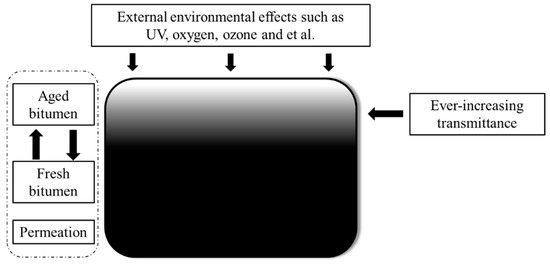 The transmittance of bitumen with 13.1 μm thickness after UV aging for different aging times is illuminated in Figure 16. It was observed that UV radiation could not reach a depth greater than 13.1 μm thickness below the bitumen surface before aging for 5 h. As the aging time increased, UV radiation reached deeper. After aging for 10 h, sectional UV radiation could pass through bitumen with 13.1 μm thickness. However, from the results of the first group, it was clear that there was a UV aging effect on bitumen after aging for 5 h. This means that bitumen which had no direct contact with UV radiation was influenced by UV radiation. Furthermore, external environmental effects should be excluded according to the results of the second group. The critical point of this phenomenon is that bitumen which had no direct contact with UV radiation, had direct contact with bitumen aged by UV radiation. The real reason why bitumen which had no direct contact with UV radiation was influenced by UV radiation, is permeation. Aged bitumen permeates fresh bitumen and fresh bitumen permeates aged bitumen. The same tests were also conducted on another bitumen sample (80/100 penetration grade) and very similar results and the same conclusions were obtained. The UV aging effect is explained in Figure 17. Bitumen on the surface was subjected to various external environmental effects such as ozone and UV radiation. Bitumen at the bottom encountered the effects of permeation and ever-increasing UV radiation transmittance.