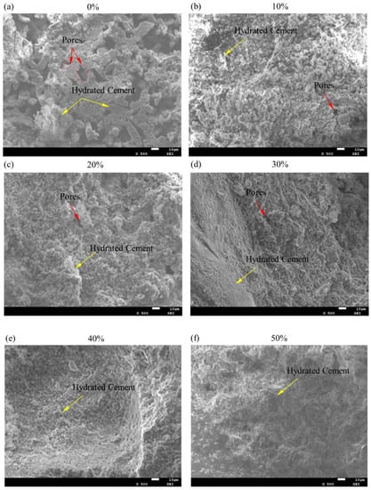 In order to validate further macro-scale thermo-mechanical properties of ZCCs, the SEM imaging is conducted to amplify 500 times the surface of fragments of specimens, which is produced from flexural testing. SEM images of ZCCs of different percentages from 0% to 60% are listed in Figure 5a–g.