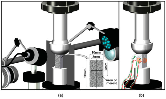 CPC testing is performed on small specimens (typically up to 20 mm in their largest dimension) [8,9,10]. Accurately measuring strain values the material undergoes to during testing is useful to compare different formulations of CPCs regarding elastic response and toughness enhancement. However, due to CPC characteristics, this is a challenge. In fact, contact-type extensometers cannot be used, because the knife edges would damage the specimen surface. Conversely, strain gauge installation may affect CPC response because of the unavoidable penetration of cyanoacrylate adhesive into the pores, which are always present in the cement matrix [8,11,12]. Therefore, the alternatives are non-contact techniques, i.e., optical methods based on interferometric techniques, or digital image correlation (DIC).