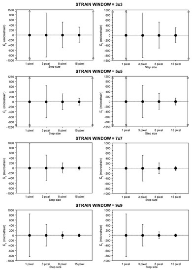 Image processing was carried out using a dedicated software (Aramis V 6.3.0, GOM mbH, Braunschwieg, Germany). Surface strain in a measurement point, i.e., the center of a subset, was calculated using a square grid containing the center points of N × N neighboring subsets [51,52], hereinafter referred to as the strain window. The 2D deformation gradient tensor was calculated solving the system of equation, based on a first-order shape function, by the least square method [53,54]. The strain window was increased, starting from 3 × 3 subset, i.e., a field of center points of 3 × 3 subset, and increasing in steps of 2 subsets, up the maximum dimension of 9 × 9. Since increasing the step size decreased the noise in zero-strain maps (Figure 2), and the processing time without losing independent data, a step size of 15 pixels was chosen, i.e., an overlap ratio between neighboring subsets of 50% [55,56]. Similarly, a 9 × 9 strain window dimension was selected, because the noise decreased in zero-strain maps by increasing the strain window (Figure 2) [57]. Therefore the first image processing was carried out using a subset size of 30 × 30 pixels, a 50% overlap ratio and a 9 × 9 strain window.