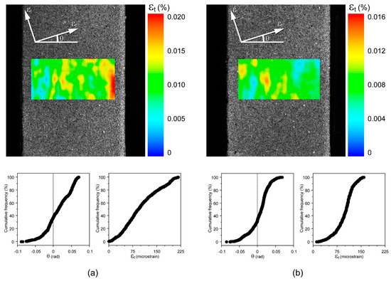 Two strain maps, with a cumulative distribution of θ and εt values, calculated for the same εl value (εl = 280 microstrain) on the same specimen surface during two different test-sessions. (a) 3SDθ > 0.1 rad: this image, and the image simultaneously acquired on the opposite surface of the specimen, must be discarded; (b) 3SDθ ≤ 0.1 rad: this image is accepted if θ distribution determined for the image simultaneously acquired on the opposite surface of the specimen fulfils the same requirement.