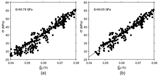 E value determined for one specimen. (a) Regression slope obtained using a subset size of 60 × 60 pixels. (b) Regression slope obtained using a subset size of 60 × 60 pixels and image pre-selection.