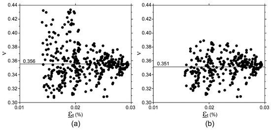 ν mean value determined for one specimen. (a) Data obtained using a subset size of 60 × 60 pixels. (b) Data obtained using a subset size of 60 × 60 pixels and image pre-selection. Note 1: The 140 microstrain threshold to εt had already been applied before calculating ν values reported in this graph. Note 2: Interchanging εl to εt in x-axis would: (i) scale the x-axis by a factor of 1/0.35 (ii) cause a small horizontal drift of each point, the entity and direction of which would depend on the difference between the current value and 0.35; no changes would occur in ν mean values.