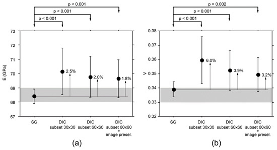 The trueness of DIC is shown in Figure 7, where values experimentally determined using SGs were used as reference. Although the bias decreased by increasing the subset size and adding image pre-selection, the difference was statistically significant in all three comparisons.