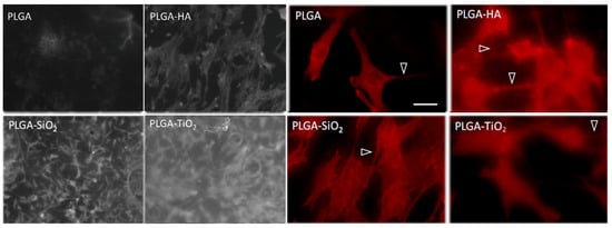 Microphotography of the osteoblasts on the membranes of PLGA, PLGA-HA, PLGA-SiO2, and PLGA-TiO2. Previously, the cells were fixed with 70% ethanol for five minutes, since without fixation it was not possible to observe them. Images taken at 5× with the fluorescence microscope Axio Observer A1 (Carl Zeiss). Bar in PLGA = 10 microns (same scale for all images). Filopodia are indicated with arrowheads.