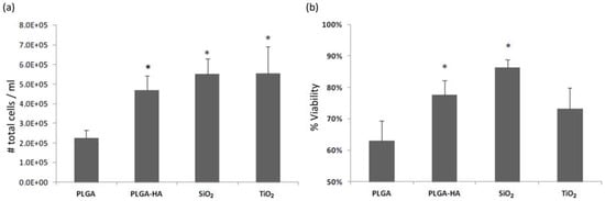 (a) Number of total cells adhered to the membranes. (b) percentage of viability of cells. *p < 0.05, statistically significant differences with respect to PLGA control membrane.