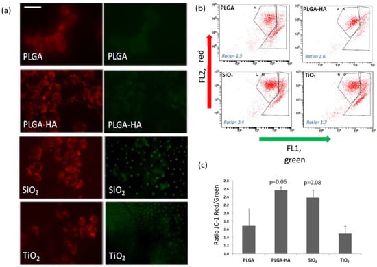 The results obtained after the determination of the mitochondrial energy balance, labelled with JC-1, are observed in Figure 3. A greater red/green ratio was observed for the osteoblasts adhered to the membranes PLGA-HA (2.57) and PLGA-SiO2 (2.38), than for PLGA (1.69) and PLGA-TiO2 (1.49), which indicates a better energy balance of the cells adhered to the membranes of PLGA-HA and SiO2 (Table 1).