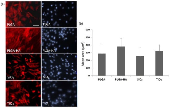 (a) Microphotography of the osteoblasts on studied membranes stained with phalloidin-TRITC 50 (red) and DAPI (blue). (b) The mean + SD of the areas of the cells adhered to the membranes is shown. Bar in PLGA = 10 microns (same scale for all images).