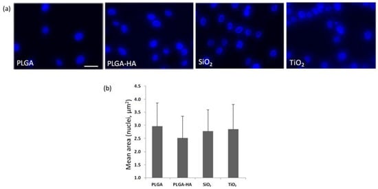 The data observed in the determination of cell growth, and morphology of the adhered osteoblasts by visualizing the cultures with Phalloidin-TRITC (Sigma) and DAPI (Sigma), reinforce the conclusions indicated in test 1 regarding cellular morphology. The membrane where the cells show a greater area is in PLGA-HA (290 μm2), followed by TiO2 (320 μm2), PLGA (290 μm2), and finally SiO2 (260 μm2), although the differences did not reach significance between the membranes. The PLGA-HA membrane also has the maximum and minimum greater area between the measurements made on the membranes. The circularity of the cells in the membranes is similar to that of the control membrane, except for TiO2, in which the cells are more damaged (Figure 4). Additionally, a measurement was made of the size of the nuclei, which is also indicative of cell damage phenomena, such as death by apoptosis. The data obtained when measuring the area of the nuclei did not show a remarkable alteration (Figure 5).