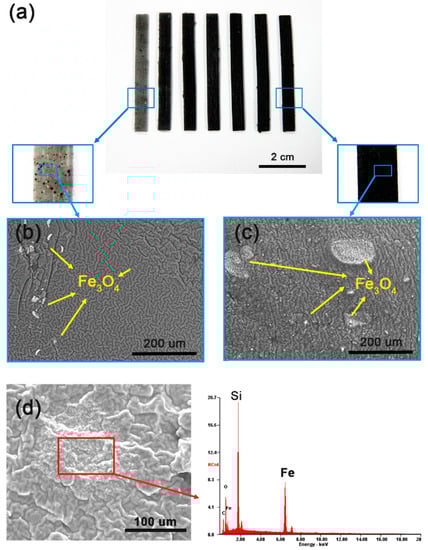 We observed an enlarged cross-section in the BSE mode of SEM analysis (Figure 1b,c). Shiny lumps, a few micrometers to several hundred micrometers in size, are positioned in the silicone matrix. In the actuator with a low iron oxide concentration of 1%, iron oxide lumps are observed only on some sides, but in an actuator with a high iron oxide concentration of 20%, lumps are distributed evenly on most parts. The higher the concentration of iron oxide particles, the greater the distribution of iron oxide masses. Microanalysis confirmed that the shiny bright spots between the silicone chains corresponded to iron (Figure 1d).
