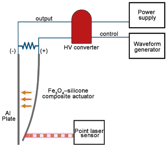 Schematic of the circuit configuration and experimental set up. A high voltage is supplied to Fe3O4-silicone composite actuators and controlled using a waveform generator. The + and − ports of the high voltage output are connected to the actuator and aluminum plate, respectively. The distances moved by the actuator are measured using a point laser sensor.