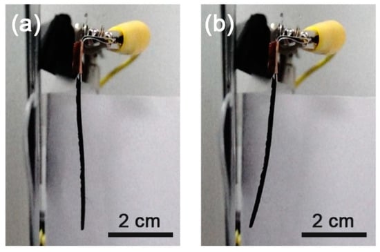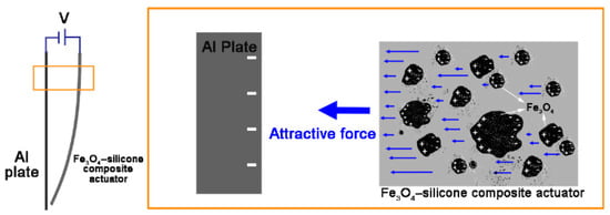 The fabricated actuator was placed in parallel to an aluminum plate of the same size (Figure 2) and they were connected to each other through different ports of the high voltage output ((+): Fe3O4-silicone actuator, (−): aluminum plate). When a voltage potential was supplied to the actuator and aluminum plate, the actuator started moving towards the aluminum plate (Figure 3a,b).