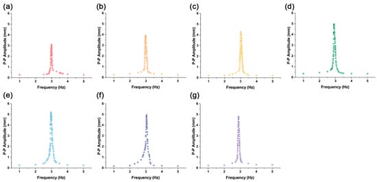 Frequency responses of Fe3O4-silicone composite actuators with different iron oxide concentrations. (a) 1%, (b) 1.5%, (c) 2%, (d) 2.5%, (e) 5%, (f) 10%, and (g) 20%.