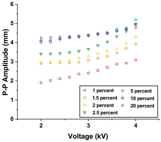 Additionally, we varied the magnitude of the applied voltage input at the resonant frequencies of the fabricated composite actuators. As the voltage increases, the peak-to-peak amplitudes of all the actuators tended to increase gradually (Figure 5). The slope of the actuator with an iron oxide concentration of 2.5% is the steepest.