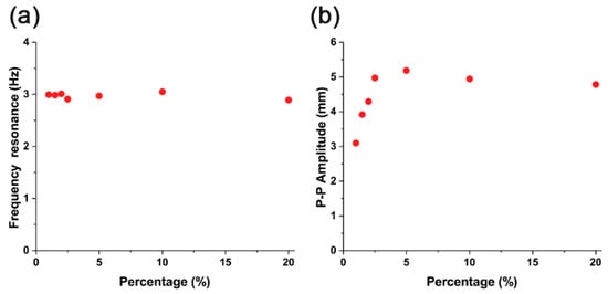 In terms of the frequency response, all actuators show a constant frequency resonance of 3 Hz ± 0.1 Hz, regardless of the iron oxide concentration (Figure 6a). In the concentration range of 1% to 2.5%, the peak-to-peak amplitudes increased (Figure 6b). However, when the iron oxide concentration was over 2.5%, the peak-to-peak amplitude saturated. At an iron oxide concentration of 5%, the highest peak-to-peak value of 5.19 mm was observed. After this point, the peak-to-peak value decreased slightly.