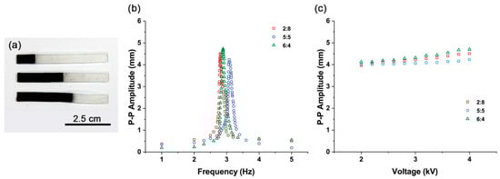 (a) Composite actuators with pure silicone-Fe3O4 and silicone mixture. From top to bottom: 2:8, 5:5, and 6:4. (b) Frequency responses of pure silicone-Fe3O4 and silicone mixture composite actuators with different Fe3O4 and silicone mixture portions. (c) Peak-to-peak amplitude changes observed at different voltage input peak-to-peak values from 2 to 4 kV in pure silicone-Fe3O4 and silicone mixture composite actuators with different Fe3O4 and silicone mixture portions.